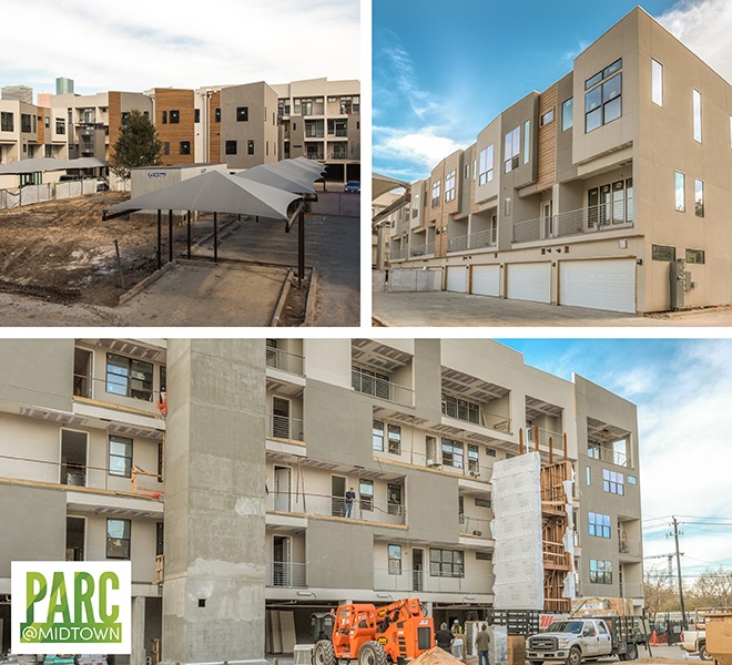 Parc at Midtown continues to progress as the construction team is finalizing cabinets and trim in the McGowen Building (building B) and working on the trim stage (plumbing, air conditioning and electric) in some of the homes. The elevator and stair towers will be finished soon. Townhome building C1 is ready for the mechanical trim stage this month, while the crew completes drywall in townhome building D1 in preparation of the trim and paint stage.
